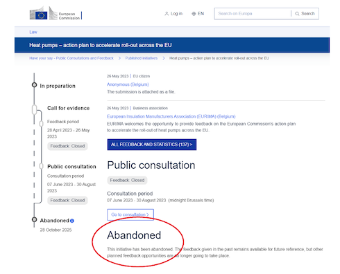 La doccia fredda, che arriva da Bruxelles, il 28 ottobre 2025 e che dice “This initiative has been abandoned”, alla pagina internet dedicata allo sviluppo delle pompe di calore (Heat pumps – action plan to accelerate roll-out across the EU) sul sito della commissione Europea, lascia sicuramente senza fiato.