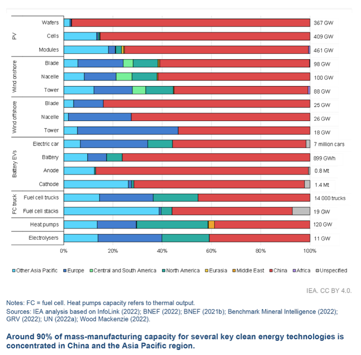 Non sono queste congetture: sono dati chiari e non è certo un segreto quanto indicato dalla IEA (International Energy Agency) quando esprime il fatto che le filiere necessarie per la decarbonizzazione dell’UE e le tecnologie connesse al mondo delle rinnovabili, purtroppo, come emerge dall’Energy Technology Perspectives 2023 (report edito da IEA), sono concentrate al di fuori del continente europeo, principalmente in Cina (in media per il 65% del totale, con punte del 90%) vedasi diagramma 1.