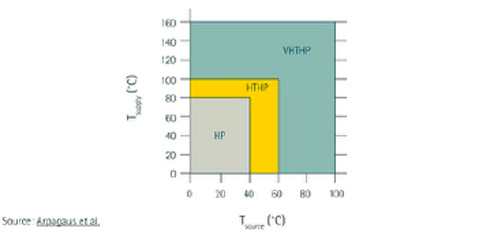 Diagramma 2 – Fonte: Pubblicazione “High temperature heat pumps: Market overview, state of the art, research status, refrigerants, and application potentials”, autori C. Arpagaus, F. Bless, M. Uhlmann, J. Schiffmann, and S. S. Bertsch [6]