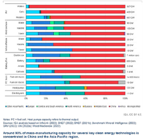 DIAGRAMMA 1: QUOTE REGIONALI DELLA CAPACITÀ PRODUTTIVA PER LA PRODUZIONE DI MASSA DI TECNOLOGIE E COMPONENTI PER L’ENERGIA GREEN, SECONDO L’ENERGY TECHNOLOGY PERSPECTIVES 2023, REPORT EDITO DA IEA