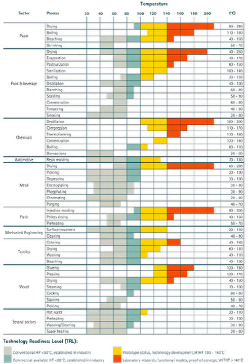 Dalla lettura della Tabella I appare evidente che il campo di applicazione delle pompe di calore sia certamente ampio e adatto a molti settori applicativi nell’industria (quelli nelle aree verde chiaro e verde scuro). Le aree gialle e arancioni, che rappresentano temperature al di sopra dei 100 °C, sono ancora saldamente dominate dalle applicazioni a combustione tradizionale. Queste includono caldaie a condensazione di tipo evoluto, modulante, con controlli digitali e alimentate a gas: una combinazione che offre certamente buoni livelli di efficienza (nell’ambito delle apparecchiature a combustione) per raggiungere alte ed altissime temperature, dove le pompe di calore oggi non riescono ad arrivare in modo efficiente, ma dove si prevede arriveranno in un tempo relativamente breve.